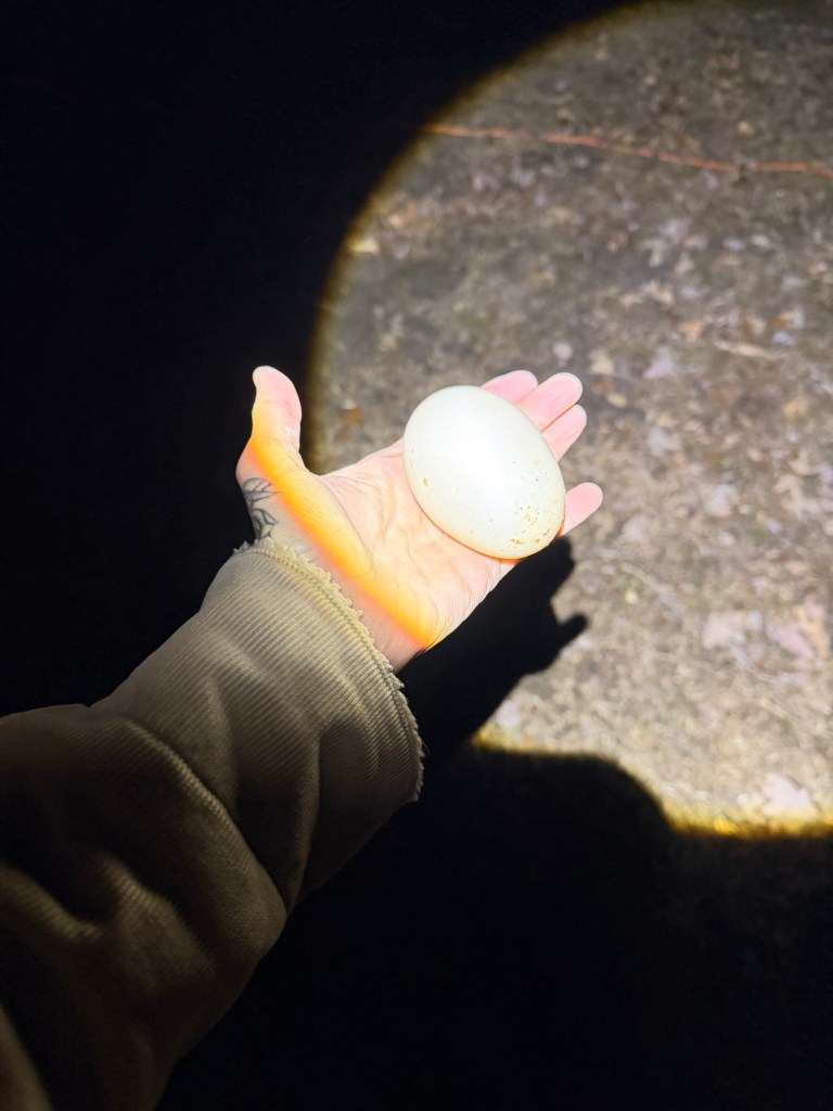After going through a very tough molt about five to six months ago, Ginger completely stopped laying. For months, there were no eggs at all. While we knew molting can pause egg production, the length of her break had us watching closely. That’s why seeing a fresh duck egg in the duck house felt like such a victory—it meant she was doing well and her body was ready again.